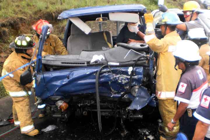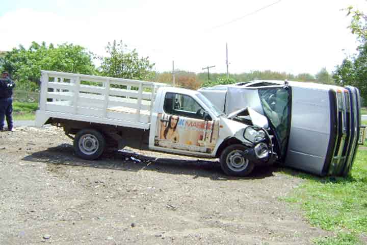 El conductor de una camioneta quedó prensado y malherido en la cabina de su unidad, tras impactarse contra el costado de otra camioneta, la cual derrapó sobre el asfalto mojado e invadió carril contrario, en la salida a Paracho, de Uruapan, frente al hotel Pie de la Sierra.