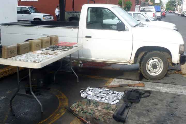 Personal militar que realizaba un recorrido de vigilancia por una brecha en el municipio de Tingambato, localizó una camioneta abandonada, la cual cuenta con reporte de robo, dentro de la cual se localizaron varios paquetes y envoltorios con mariguana, así como cuatro armas de fuego, cartuchos y cargadores de diversos calibres.