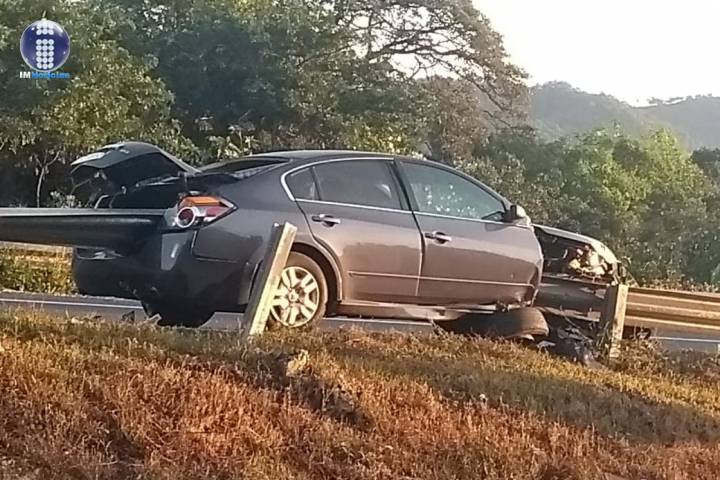 El conductor de un automóvil salvó la vida milagrosamente, luego de que se impactara contra una banda metálica de protección, la cual se incrustó al frente, cruzó la zona del copiloto y salió por la cajuela; aparatoso accidente ocurrido la mañana de este domingo en el entronque con la llamada autopista Siglo XXI.