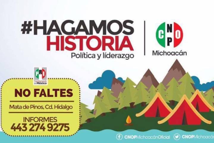 NOTICIAS 06/10/2016CNOP Michoacán realizará el campamento "Hagamos Historia"La Confederación Nacional de Organizaciones Populares (CNOP) en Michoacán, realizará el campamento denominado "Hagamos Historia", con la finalidad de efectuar una capacitación ideológica, programática y operativa entre los agremiados, para elevar su nivel de profesionalización política.