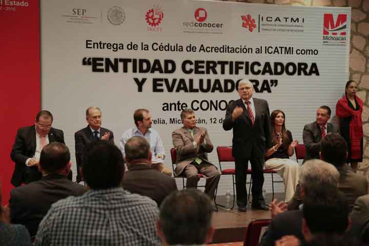 El secretario de Educación en el Estado, J. Jesús Sierra Arias, presidió, a nombre del gobernador Fausto Vallejo Figueroa, la ceremonia de entrega de Cédula de Acreditación como Entidad Certificadora y Evaluadora al Instituto de Capacitación para el Trabajo del Estado de Michoacán (ICATMI), por parte del Sistema Nacional de Competencias (CONOCER).