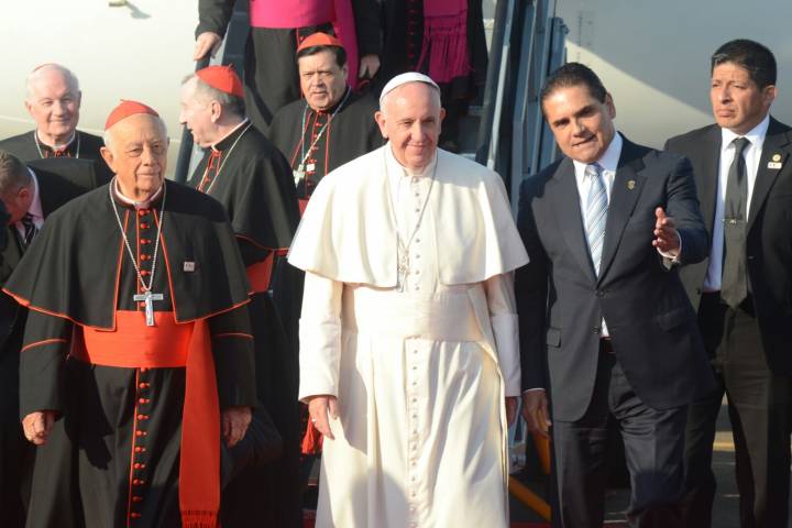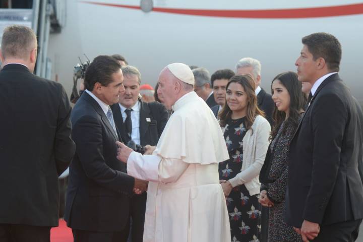 Acompañado por sus hijas, Sofía y Elizabeth Aureoles, y por el cardenal Alberto Suárez Inda, el mandatario estatal recibió al Papa Francisco al final de la escalinata del avión que tocó la tierra michoacana en punto de las 8:45 horas de este 16 de febrero, lo que provocó el júbilo y... Ver más...