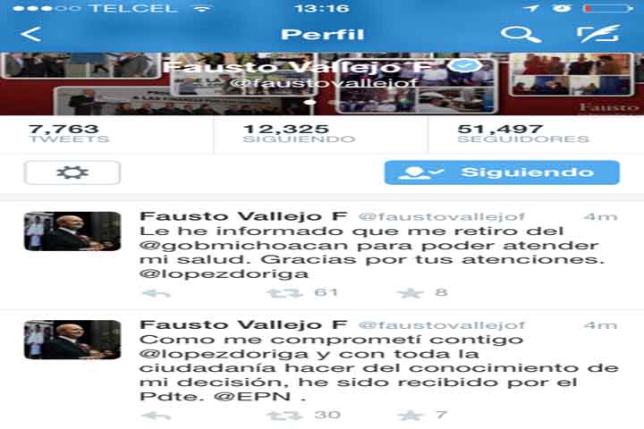 "Me voy con dignidad, me voy con la frente en alto porque lo más importante es la salud de Michoacán: @faustovallejof", según se difundió a través de la cuenta de twitter del Gobierno del Estado.