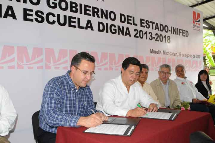 El gobernador del Estado Jesús Reyna García, signó el convenio de colaboración con el Instituto Nacional de Infraestructura Física Educativa (INIFED), que tiene la finalidad de adherir a Michoacán al Programa Escuelas Dignas 2013 - 2018, con una inversión de más de 105 millones de pesos, entre Estado y Federación.