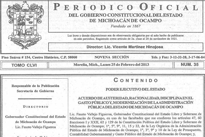NOTICIAS 25/02/2013Publican acuerdo de austeridad de Gobierno del Estado
