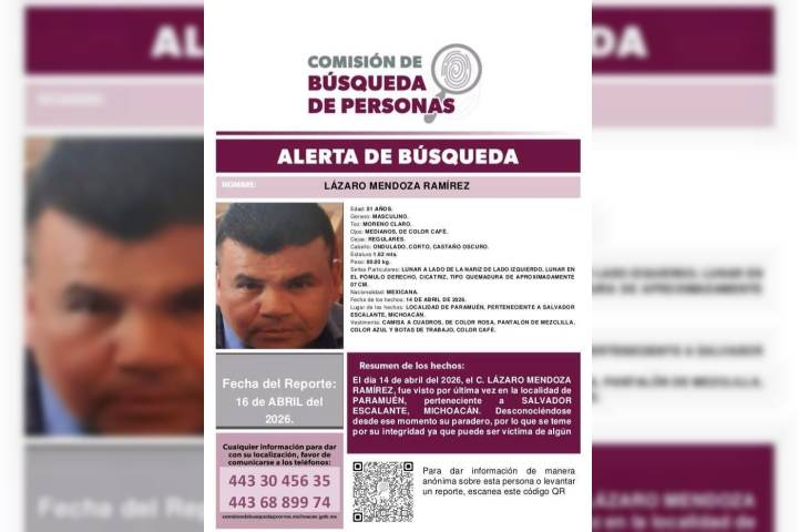 NOTICIAS 18/04/2026Identifica FGE a persona localizada sin vida en Salvador Escalante; se trata de Lázaro "N"La Fiscalía General del Estado de Michoacán (FGE) informa que, derivado de estudios científicos realizados por personal especializado, fue plenamente identificado el cuerpo de una persona localizada sin vida en el municipio de Salvador Escalante; se trata de Lázaro "N", quien contaba con reporte de desaparición presentado el pasado 15 de abril.