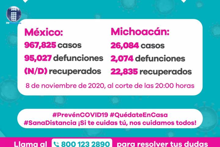 NOTICIAS 08/11/2020Son 2 mil 74 defunciones por COVID-19 en MichoacánEn la Unidad de Inteligencia Epidemiológica y Sanitaria (UIES), se han recibido un total de 62 mil 496 notificaciones de enfermos de vías respiratorias a descartar coronavirus, 35 mil 2 cumplieron con definición operacional resultando negativas a COVID-19, es decir, no tienen el virus.
