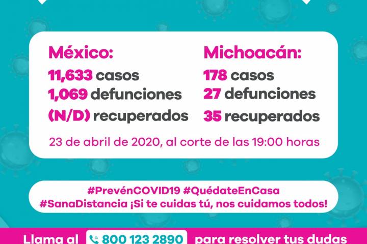 NOTICIAS 23/04/2020Suman 27 defunciones por COVID-19 en MichoacánEn la UIES ESTATAL, se han recibido un total de 1 mil 363 notificaciones de enfermos de vías respiratorias, a descartar coronavirus, 935 cumplieron con definición operacional resultando negativas a COVID-19, es decir, no tienen el virus.