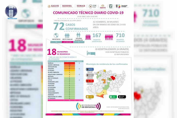 En la UIES ESTATAL, se han recibido un total de 710 notificaciones de enfermos de vías respiratorias, a descartar coronavirus, 452 cumplieron con definición operacional resultando negativas a COVID-19. Hay 167 sospechosos en diferentes municipios y se encuentran en proceso. Hasta el día de hoy se han acumulado 72 casos confirmados (4 casos nuevos) y 12 defunciones de pacientes positivos a COVID-19 en la entidad. 24 michoacanos se han ...