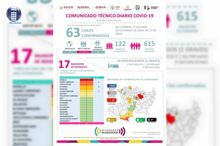 NOTICIAS 12/04/2020Suman 9 defunciones por COVID-19 en Michoacán En la UIES ESTATAL, se han recibido un total de 615 notificaciones de enfermos de vías respiratorias, a descartar coronavirus, 430 cumplieron con definición operacional resultando negativas a COVID-19.