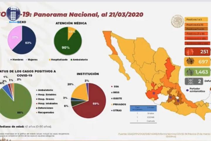 NOTICIAS 22/03/2020Suman 251 casos confirmados de coronavirus en MéxicoLa Secretaría de Salud informó este sábado 21 de marzo de 2020 que el número de casos positivos por coronavirus (COVID-19) subió a 251, mientras que el número de pérdidas humanas se mantiene en solo dos defunciones.