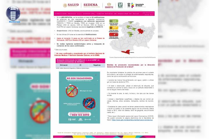 NOTICIAS 22/03/2020Ya son 8 casos de Covid-19 en MichoacánEn la UIES ESTATAL, se ha recibido un total de 52 notificacionesde enfermos de vías respiratorias, a descartar coronavirus, CUARENTA Y CINCO cumplieron con definición operacionalTREINTA Y TRES en Morelia, TRES en Uruapan, UNO en LaPiedad, UNO en Jacona, UNO en Zamora, UNO en Zacapu yCUATRO en Lázaro Cárdenas resultando negativas a COVID-19.