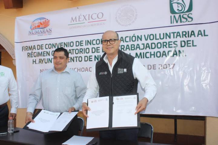 Con la firma del Convenio de Incorporación Voluntaria al Régimen Obligatorio de los Trabajadores del Honorable Ayuntamiento de Numarán, 27 trabajadores de seguridad pública del municipio de Numaran serán incorporados al régimen obligatorio del IMSS. El Delegado Regional del Instituto Mexicano del Seguro Social (IMSS) en Michoacán, Román Acosta Rosales, y el Presidente del H. Ayuntamiento de Numarán, Daniel Zárate Estrada, signaron ...