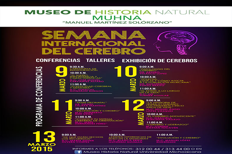 El Museo de Historia Natural "Manuel MartÃnez Solórzano" de la Universidad Michoacana de San Nicolás de Hidalgo (UMSNH), invita a la comunidad académica y estudiantil asà como público en general, a la "Semana Internacional del Cerebro 2015", evento que se desarrollará del 9 al 13 marzo.
