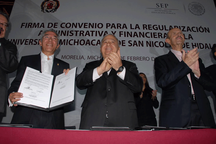 NOTICIAS 10/02/2014Firman convenio para la regularización administrativa de la UMSNHEl Secretario de Educación Pública, Emilio Chuayffet Chemor acudió personalmente a la firma de un convenio con el rector de la Universidad Michoacana de San Nicolás de Hidalgo, Salvador Jara Guerrero, para la Regularización Administrativa y Financiera de la Máxima Casa de Estudios en la Entidad, acuerdo signado también por el gobernador Fausto Vallejo Figueroa.