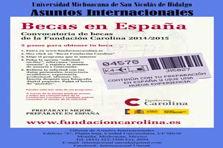 Como parte de las gestiones de la Oficina de Asuntos Internacionales de la Universidad Michoacana de San Nicolás de Hidalgo (UMSNH), se dio a conocer la convocatoria abierta para realizar estudios de intercambio en España a través de Fundación Carolina, informó Rosa Lizett García García, titular de la dependencia universitaria.