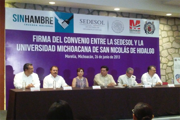 La Universidad Michoacana de San Nicolás de Hidalgo (UMSNH) y la SecretarÃa de Desarrollo Social signaron un convenio de colaboración en el que 287 jóvenes nicolaitas participarán como brigadistas para los 7 municipios en los que se aplicará el programa federal de la Cruzada Nacional Sin Hambre.