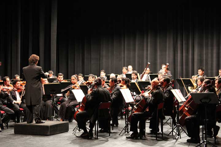 Integrantes de la Orquesta Sinfónica de Michoacán encabezada por el director artÃstico Miguel Sal...