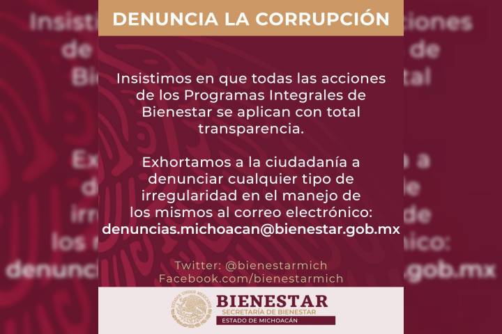 La Secretaría de Bienestar en Michoacán llama a la ciudadanía a reportar cualquier mal uso de los...