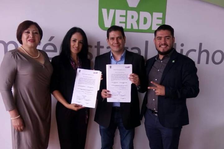 La dirigencia estatal del Partido Verde Ecologista de México celebra la entrega de constancias que...