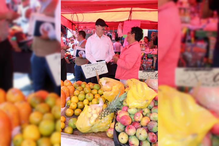 Ante tianguistas de la colonia Melchor Ocampo de esta capital, Fausto Vallejo Figueroa, candidato de...