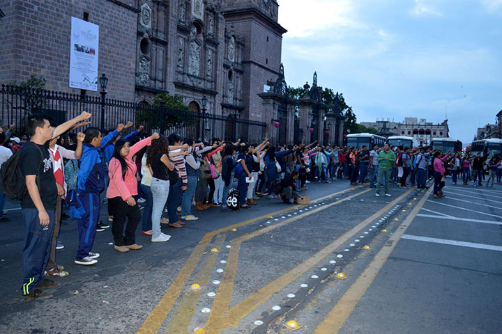Normalistas arribaron al primer cuadro de la ciudad donde bloquean la circulación vehicular. Min...