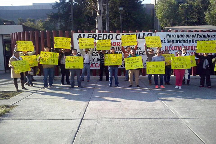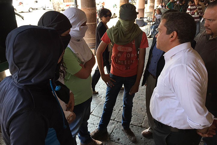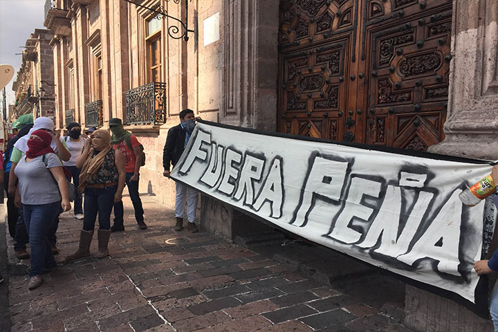 Integrantes de la Escuela Normal Superior de Michoacán, se manifiestan afuera de Palacio de Gobiern...