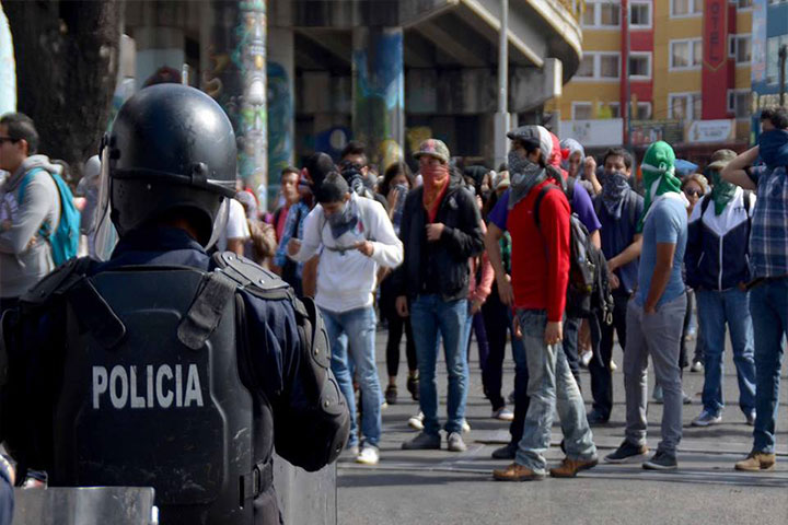 Un grupo de normalistas se manifiestan en la avenida Madero en su cruce con la avenida periodismo. ...