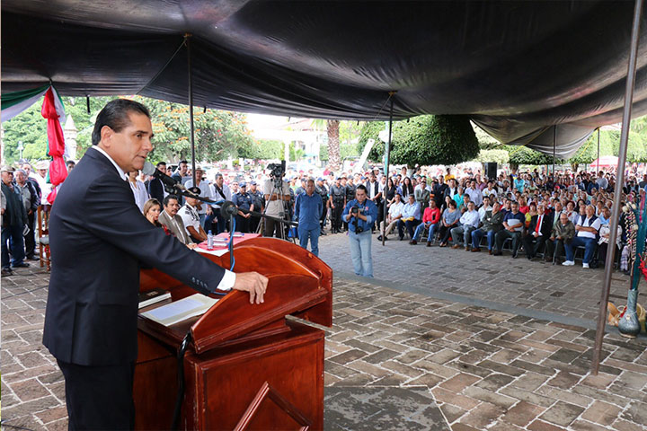 Ante más de 3 mil personas reunidas en la plaza principal de Uruapan, Silvano Aureoles Conejo aco...