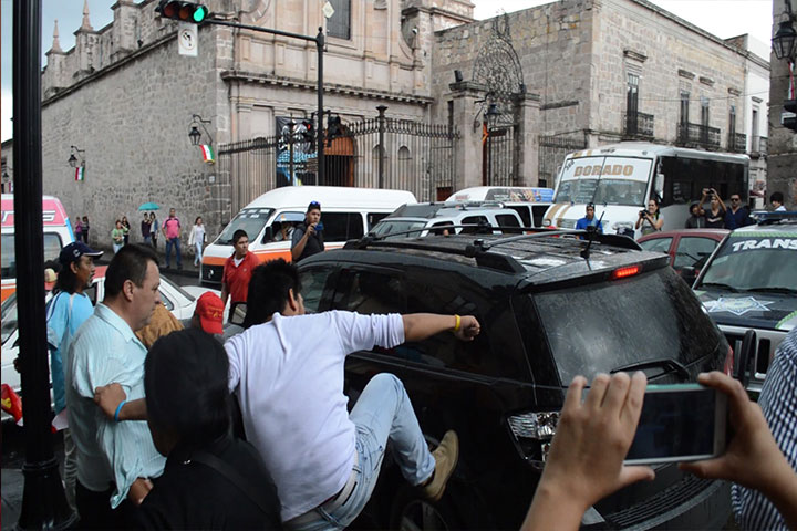 Seguidores de Baltazar Gaona arremeten contra camioneta de Alfredo Jiménez