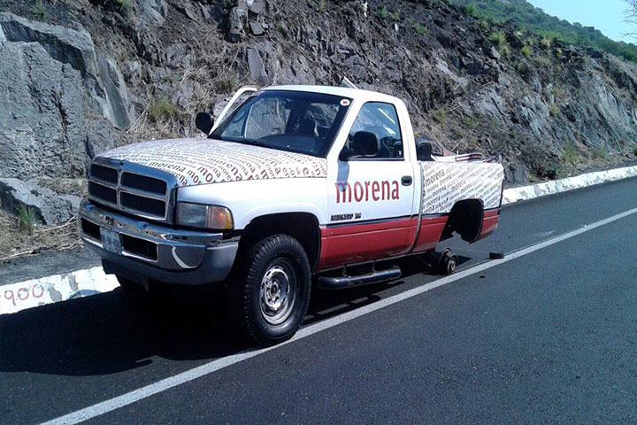Una camioneta del partido Movimiento de Regeneración Nacional (Morena) se accidentó sobre la car...