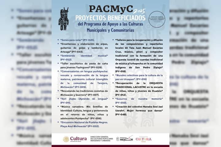 NOTICIAS 01/10/2025 Secum anuncia a los 14 beneficiarios del Pacmyc 2025La SecretarÃa de Cultura de Michoacán en coordinación con la SecretarÃa de Cultura federal dieron a conocer los resultados del Programa de Apoyo a las Culturas Municipales y Comunitarias (Pacmyc) 2025, en el que participaron 65 proyectos comunitarios del estado.