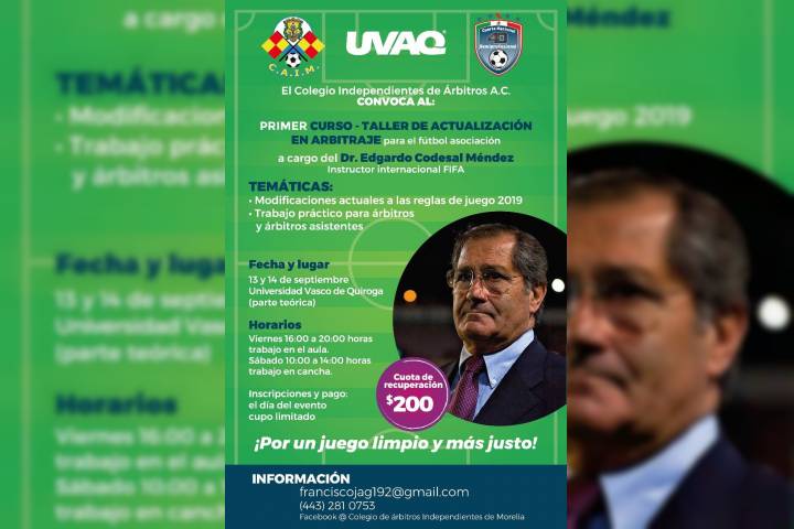 Bajo el slogan "Por un juego limpio y más justo", los días 13 y 14 de septiembre en las instalaciones de la Universidad Vasco de Quiroga (UVAQ), se realizará el Primer Curso-Taller de Actualización en Árbitros para el Futbol Asociación, impartido por el exárbitro internacional Edgardo Codesal Méndez.