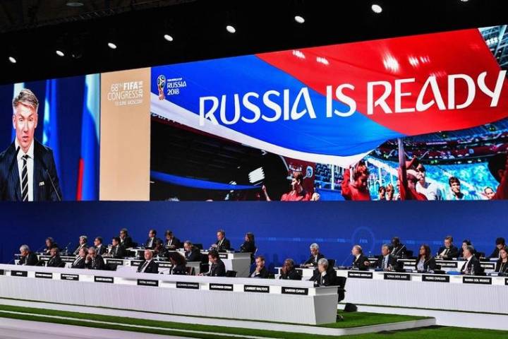Los delegados observan la presentación de la candidatura conjunta de Estados Unidos, Canadá y México para organizar la Copa Mundial de la FIFA 2026 durante el 68º Congreso de la FIFA en Moscú, Rusia, el 13 de junio de 2018.