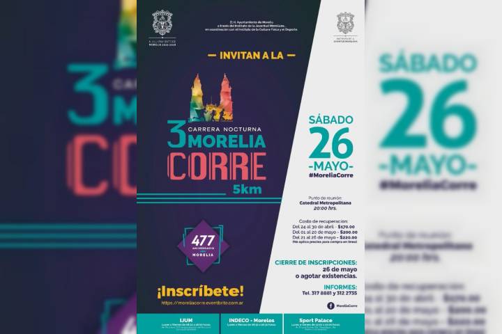 NOTICIAS 14/05/2018Ciudadanía aún tiene oportunidad de inscribirse a tercera Carrera "Morelia Corre" El Ayuntamiento de Morelia, a través del Instituto de la Juventud Moreliana (IJUM), recuerda a la ciudadanía que aún existen espacios disponibles para la Tercera Carrera Nocturna "Morelia Corre" que se realizará el próximo sábado 26 de mayo al filo de las 20:00 horas y permitirá hacer un recorrido por los inmuebles más representativos del Primer Cuadro de la Ciudad en el marco de actividades del 477 Aniversario de Morelia.