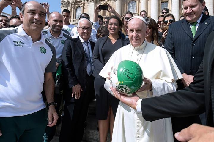 La plantilla jugadores y dirigentes del equipo de fútbol brasileño Chapecoense visitaron este miércoles al papa Francisco, tras la audiencia general celebrada en la Plaza de San Pedro, en Vaticano, Roma.