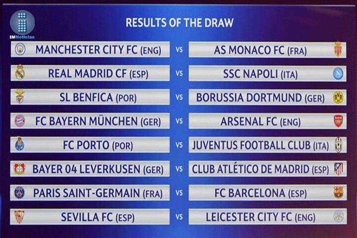 NOTICIAS 12/12/2016Listos octavos de final de la Liga de CampeonesEl duelo entre Paris Saint Germain y FC Barcelona se perfila como el choque estrella de los octavos de final de la Liga de Campeones de la UEFA, cuyos emparejamientos se han conocido este 12 de diciembre en el sorteo celebrado en Nyon, en la sede de la UEFA. Los demás equipos españoles se medirán, a priori, a equipos más accesibles: el Real Madrid lo hará ante el Nápoles italiano, el Atlético de Madrid frente al Bayer Leverkusen alemán, y... Ver más...