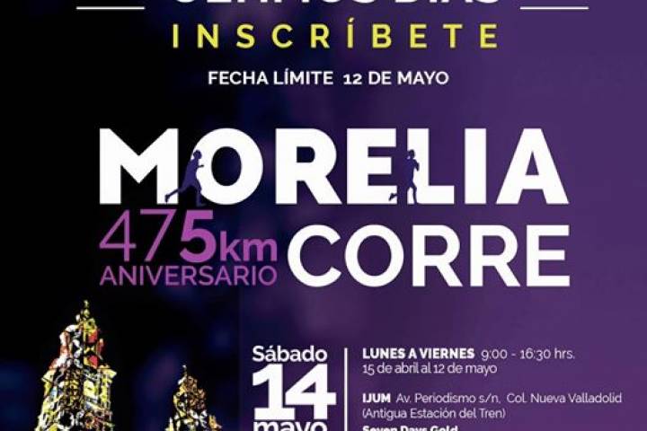NOTICIAS 10/05/2016Últimos días para inscribirse a Carrera Nocturna "Morelia Corre"Este jueves 12 de mayo vence el plazo de inscripción para participar en la carrera nocturna denominada "Morelia Corre", misma que es impulsada por el Ayuntamiento de Morelia a través del Instituto de la Juventud Moreliana, como parte de las actividades conmemorativas al 475 aniversario de fundación de la ciudad de la cantera rosa.