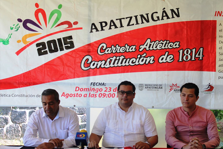 NOTICIAS 19/08/2015Presentan carrera atlética "Constitución de 1814" 8kCon una bolsa en premiación de 20 mil pesos, el próximo domingo 23 de agosto, se llevará a cabo la carrera atlética "Constitución de 1814" 8k. en la ciudad de Apatzingán. Con la participación de 500 corredores de diversos puntos del estado. Competencia organizada por la dirección de Promoción Deportiva de dicho municipio.