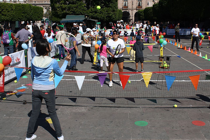 La plaza Benito Juárez del centro histórico de la ciudad de Morelia, se engalanó con la realización de la primera exhibición de Tenis Urbano "porque el tenis es para todos", organizado por Vélez Tennis Academy (VTA), en coordinación con el Instituto Municipal de Cultura FÃsica y Deporte (IMDE) y la Asociación Michoacana de Tenis (AMT), que dirige Joel Calderón. Evento que reunió a más de 200 personas de diferentes edades.