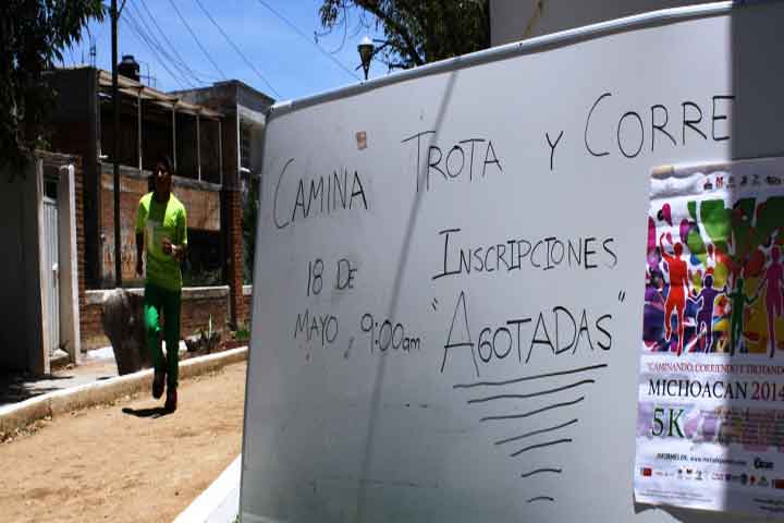 NOTICIAS 16/05/2014Agotadas inscripciones para el serial "Camina Trota y Corre por Michoacán"Con dos días para el arranque del serial "Camina, Corre y Trota por Michoacán" y gracias a la convocatoria del ayuntamiento de Morelia y de la Comisión Nacional de Cultura Física y Deporte (CONADE), las inscripciones a la justa se agotaron con lo cual se asegura la presencia de por lo menos mil almas el próximo domingo 18 del presente mes, cuando se ponga en marcha esta concurrida actividad recreativa.