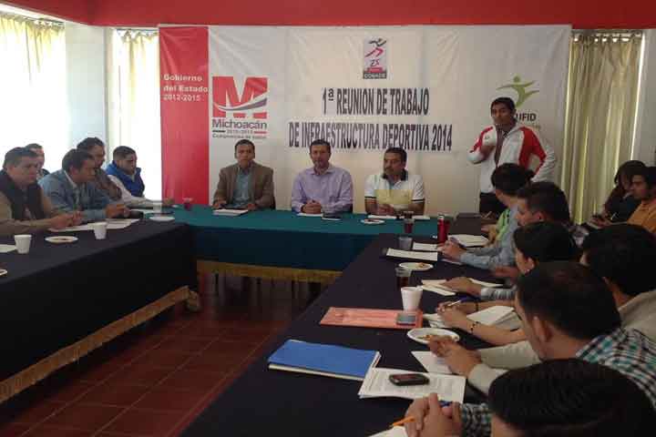 NOTICIAS 16/04/2014Trabajan para aplicar recursos del programa de infraestructura deportivaMichoacán en este 2014 recibirá un apoyo de 165 millones 400 mil pesos, destinados para 53 obras de construcción y rehabilitación de obras deportivas en 33 municipios, como parte del Programa de Infraestructura Deportiva Municipal de la Comisión Nacional de Cultura Física y Deporte (CONADE).