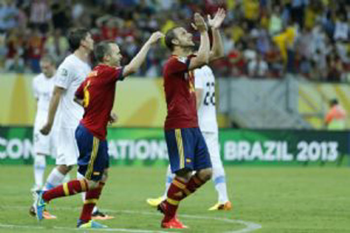 La campeona mundial España mostró todo su repertorio ante Uruguay, a quien venció 2 por 1 en el partido que dejó inaugurado el Grupo B de la Copa FIFA Confederaciones Brasil 2013. El encuentro se disputó el domingo 16 de junio en estadio Arena Pernambuco de Recife.