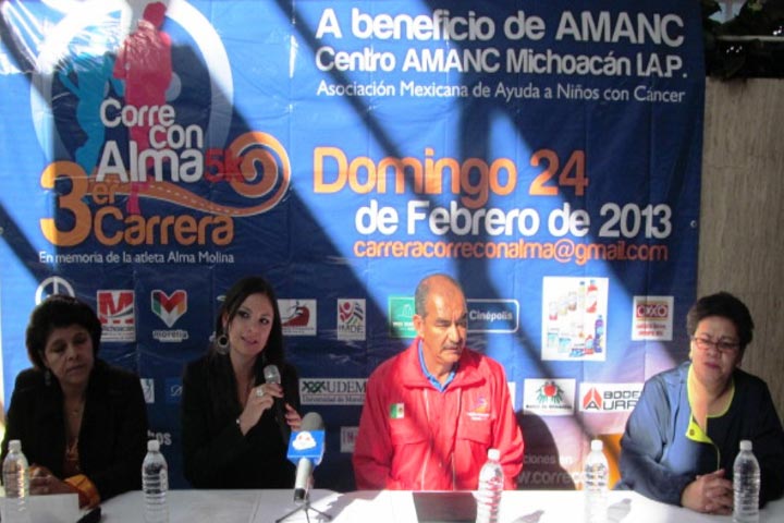 Bajo el slogan "Corre con Alma" en memoria de la atleta Alma Molina en su primer aniversario luctuoso, el próximo 24 de febrero se llevará a cabo la 3ª edición de la Carrera Atlética a beneficio de la Asociación Mexicana de Ayuda para Niños con Cáncer (AMANC), organismo privado que atiende a un total de 162 niños en el estado de Michoacán.