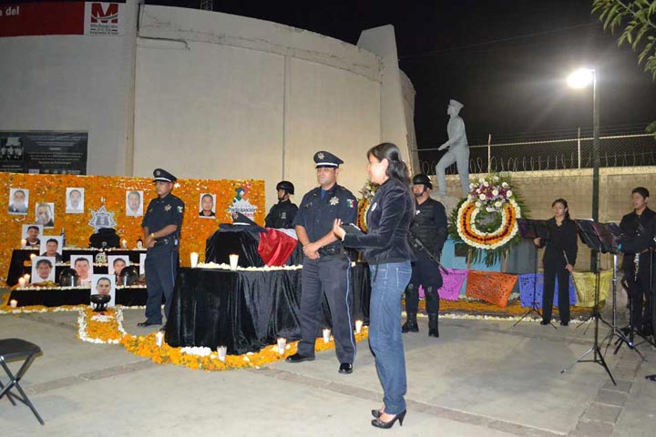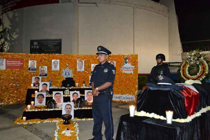 NOTICIAS 02/11/2013Los policías recuerdan también a sus muertosPara impulsar las tradiciones mexicanas, en el marco del Día de Muertos personal de la Dirección de Participación Ciudadana para la Prevención del Delito, de la Secretaría de Seguridad Pública del Estado (SSPE), colocó un altar a los policías caídos en el cumplimiento de su deber, en las inmediaciones de la Dirección de Seguridad Pública.