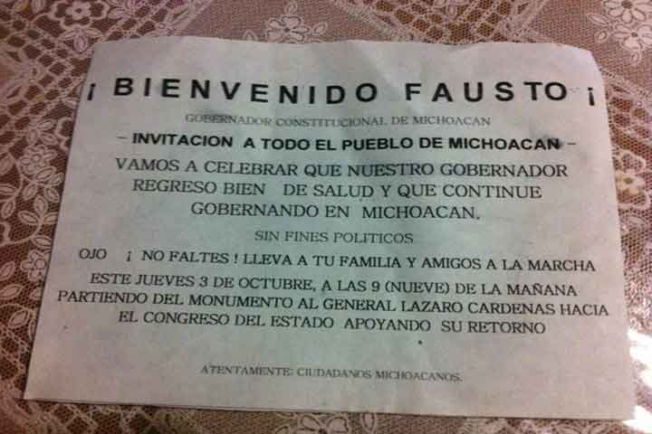 Dentro del plazo que anunció Fausto Vallejo que regresaría al frente de la administración estatal, han comenzado a circular volantes en los que se invita al pueblo de Michoacán a "darle la bienvenida" al mandatario constitucional.