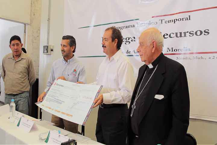 Durante la entrega de recursos del Programa de Empleo Temporal, destinados al pago de 355 jornaleros agrícolas que abastecen al Banco de Alimentos de Morelia, el arzobispo Alberto Suarez Inda, celebró la sensibilidad de la delegación en Michoacán de la Secretaria de Desarrollo Social al fomentar este tipo de iniciativas de la Sociedad Civil que hoy cumple 18 años.