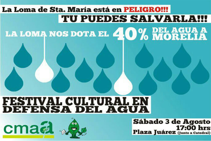 El Primer Festival Cultural en Defensa del Agua que se realizará el sábado 3 de agosto en el centro de Morelia, permitirá a la sociedad civil conocer las acciones en materia de protección del vital lÃquido que se realizarán no solo en la capital del estado, sino en todo Michoacán, señaló el vocero del Movimiento Ciudadano en Defensa de la Loma (MCDL), Moctezuma Madrigal.