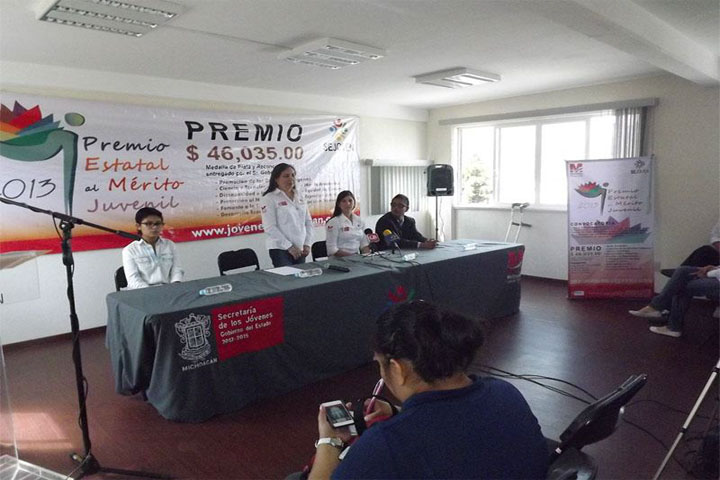 Se presentó de manera oficial la convocatoria del Premio Estatal al Mérito Juvenil 2013, que es el reconocimiento más importante que el Gobierno del Estado de Michoacán, a través de la Secretaría de los Jóvenes (SEJOVEN), otorga año con año a las y los jóvenes michoacanos que se distingan por sus logros, talentos y aportaciones al desarrollo de la sociedad.