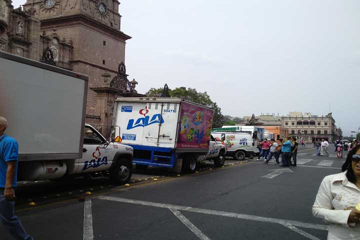 Los jóvenes arribaron al primer cuadro de la capital michoacana pasadas las 11:30 horas. Esta vez, llegaron al lugar con autobuses y vehículos particulares secuestrados. En total son 6 autobuses, 2 camionestas de Lala, 1 de la refresquera Pepsi, 1 de Gamesa, 1 de Bimbo y 1 más de Bonafont.